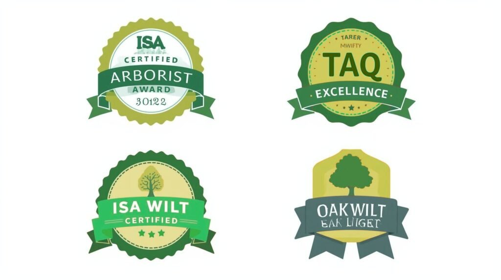 Badges: Licensed • Insured • Background-Checked • ISA Certified Arborists • TAQ Certified • Oak Wilt Certified